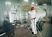 Brian estimates that Valtek's work is split evenly between overall paint jobs and repairs. The monthly output is about 50 jobs, ranging from small post office trucks to cranes.